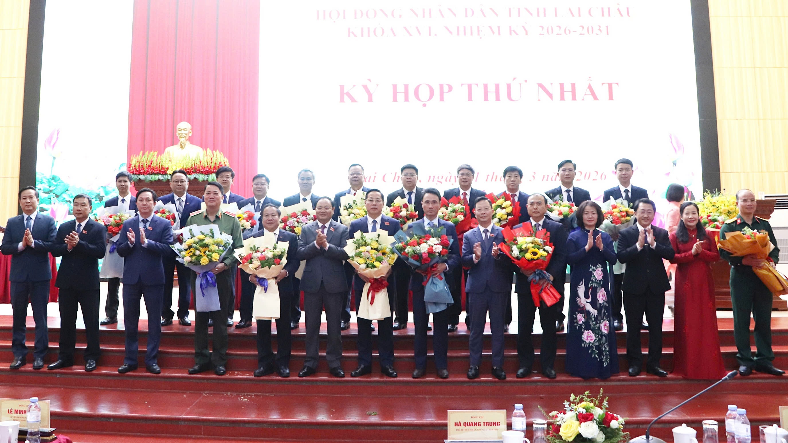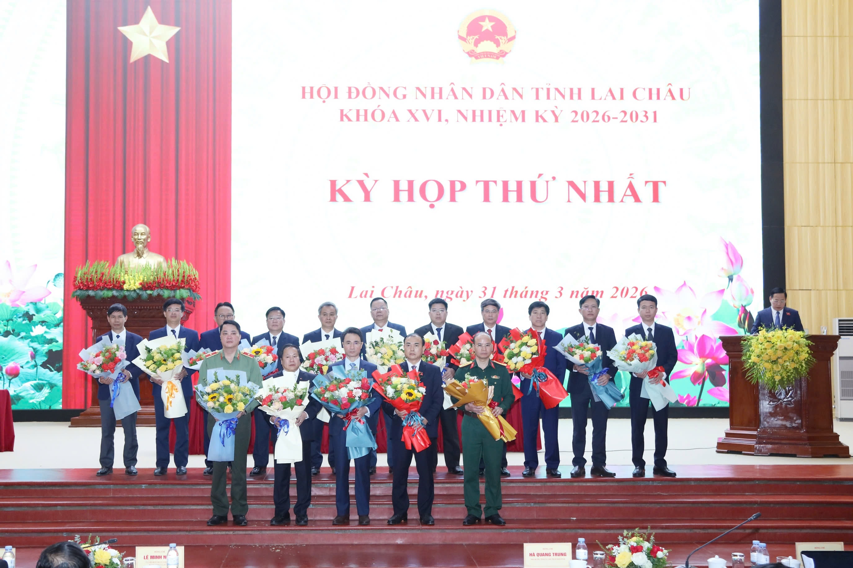 Bí thư Tỉnh ủy, Chủ tịch HĐND tỉnh Lê Minh Ngân cùng các lãnh đạo tỉnh tặng hoa chúc mừng Chủ tịch UBND tỉnh Hà Quang Trung; các Phó Chủ tịch UBND tỉnh và các Ủy viên UBND tỉnh khóa XVI, nhiệm kỳ 2026 - 2031