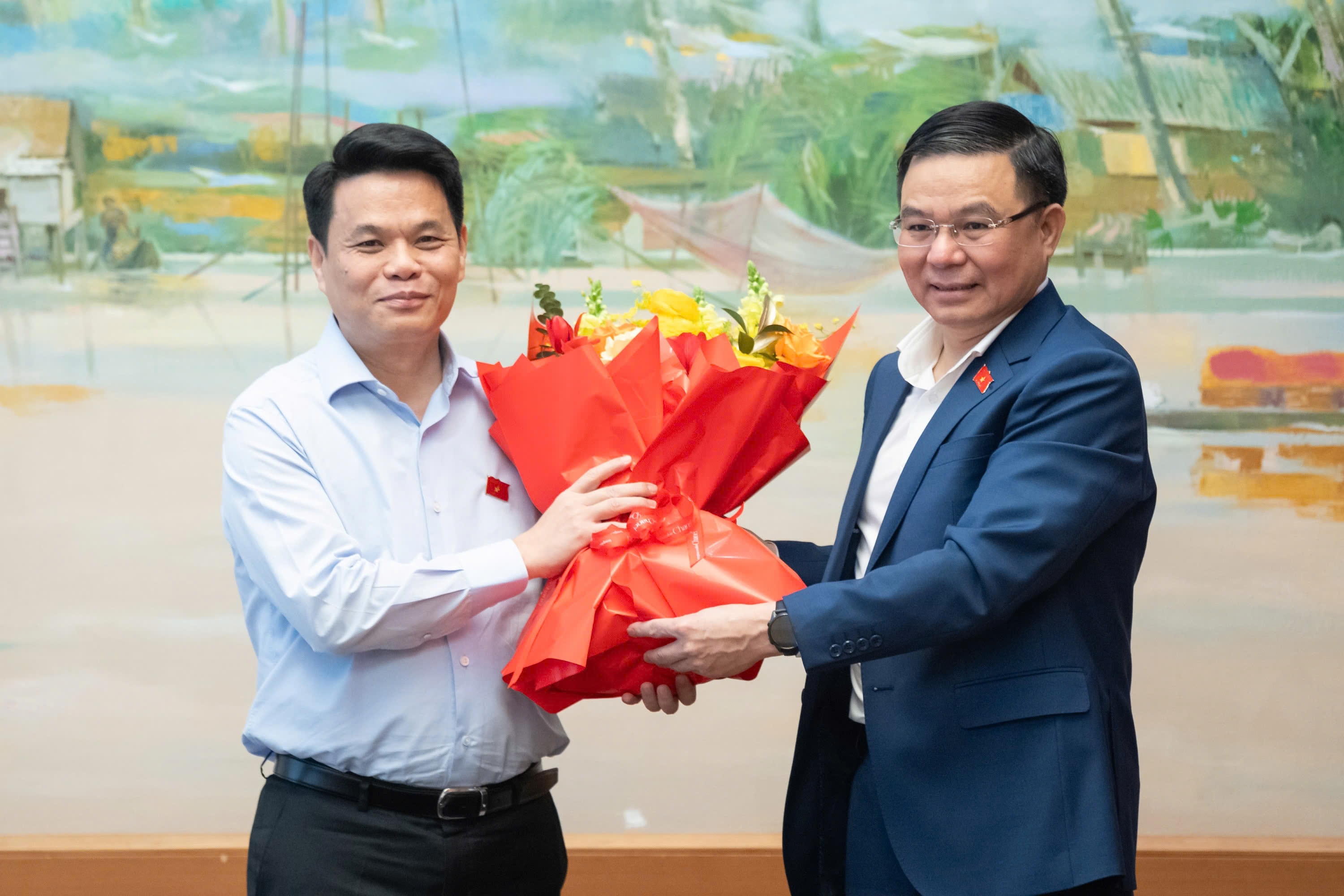 Bộ trưởng Bộ Công Thương Lê Mạnh Hùng tặng hoa chúc mừng Trưởng Đoàn ĐBQH thành phố Hải Phòng khóa XVI Lê Ngọc Châu