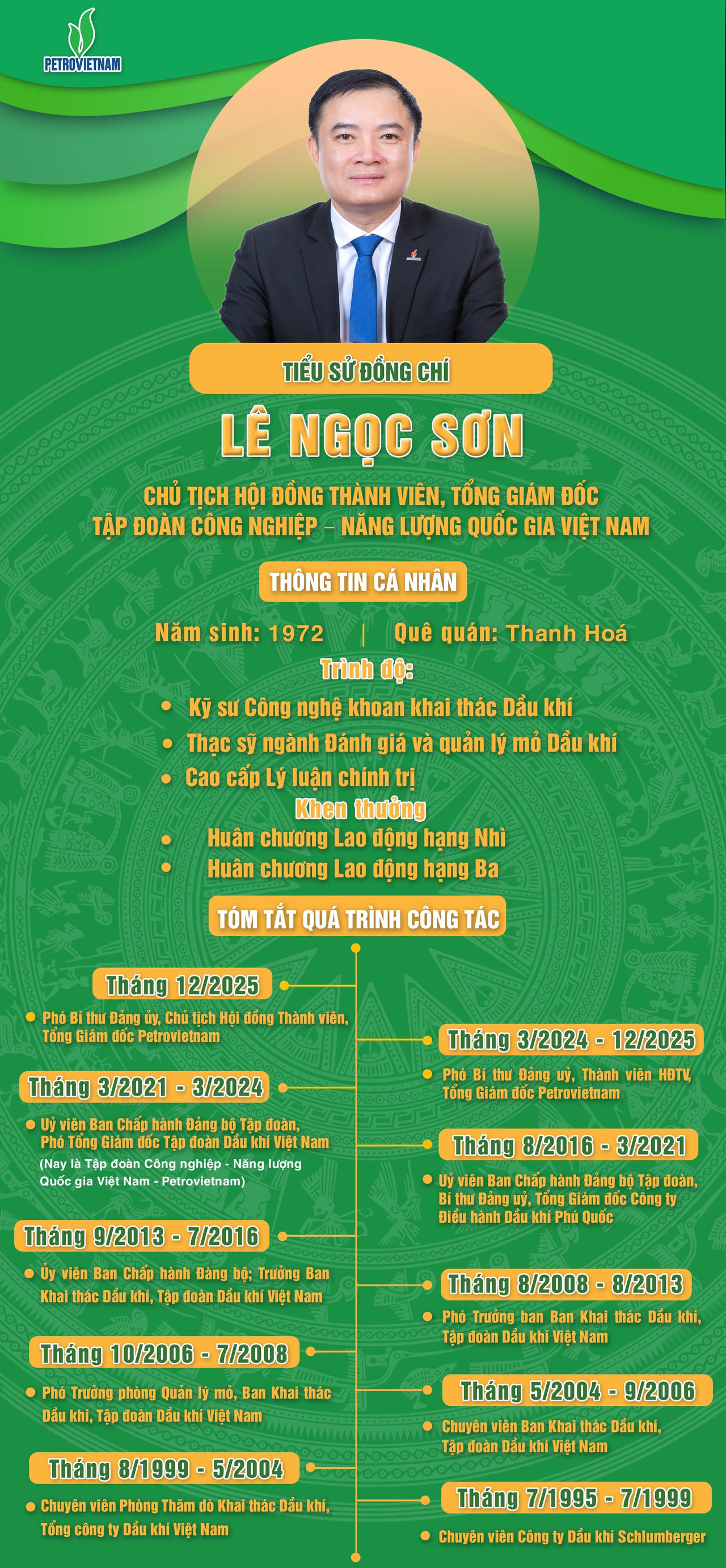 Tân Chủ tịch Petrovietnam Lê Ngọc Sơn sinh năm 1972, quê Thanh Hóa; có trình độ thạc sĩ Đánh giá và Quản lý mỏ dầu khí, kỹ sư Công nghệ khoan – khai thác dầu khí. Với gần 30 năm công tác trong ngành dầu khí, đồng chí đã trải qua nhiều vị trí lãnh đạo, quản lý quan trọng trong Tập đoàn.