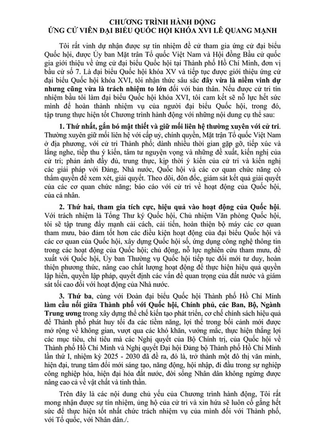 Ông Lê Quang Mạnh, Ủy viên Ban Chấp hành Trung ương Đảng; Ủy viên Ban Thường vụ Đảng ủy Quốc hội, Ủy viên Ủy ban Thường vụ Quốc hội, Bí thư Đảng ủy Văn phòng Quốc hội, Tổng Thư ký Quốc hội - Chủ nhiệm Văn phòng Quốc hội; Chánh Văn phòng Hội đồng bầu cử quốc gia, ứng cử ĐBQH khóa XVI tại đơn vị bầu cử số 7.