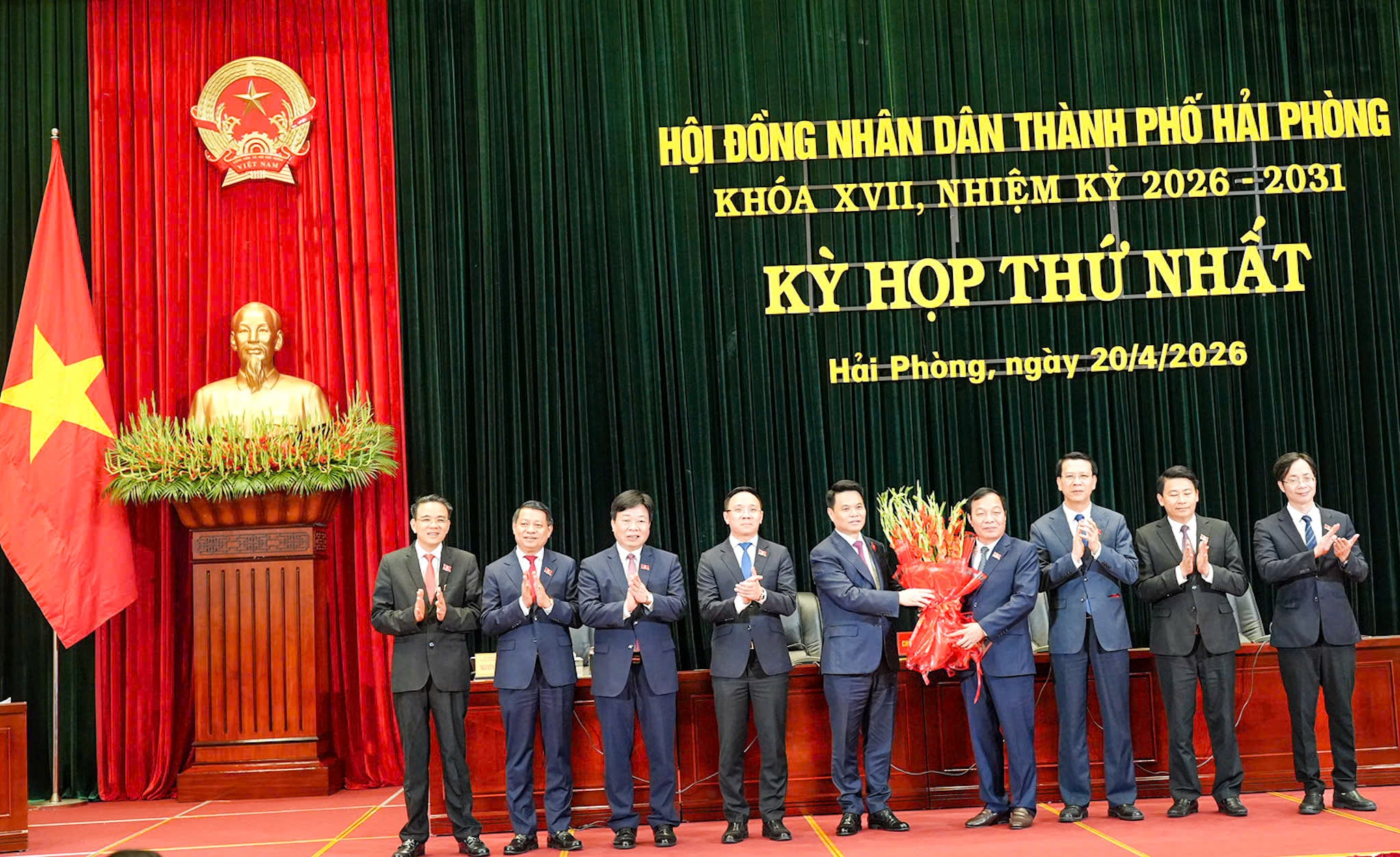 Lãnh đạo Thành ủy tặng hoa chúc mừng Chủ tịch HĐND thành phố và các Phó Chủ tịch HĐND thành phố Hải Phòng khóa XVII