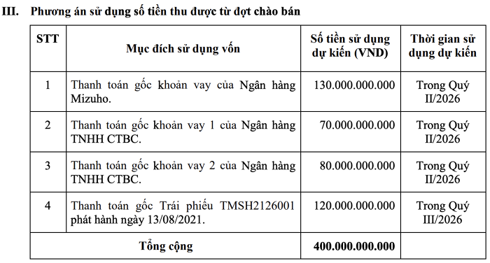 Bên cạnh đó, ban lãnh đạo cũng sẽ báo cáo cổ đông về kế hoạch phát hành trái phiếu và phương án sử dụng 400 tỷ đồng huy động được. Cụ thể, nguồn vốn này dự kiến sẽ được TMS dùng để thanh toán gốc các khoản vay tại ngân hàng Mizuho (130 tỷ), ngân hàng TNHH CTBC (150 tỷ), đồng thời tất toán trái phiếu mã TMSH2126001 là 120 tỷ đồng.