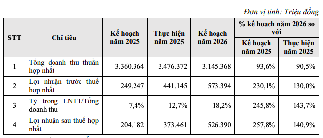 Theo kế hoạch, doanh nghiệp đặt mục tiêu doanh thu thuần đạt 3.145 tỷ đồng, giảm 6,4% so với thực hiện năm 2025. Lợi nhuận sau thuế dự kiến đạt hơn 526,3 tỷ đồng, tăng mạnh 40,9% so với năm 2025. Nếu hoàn thành, đây sẽ là mức lợi nhuận cao nhất của công ty trong vòng 4 năm qua.