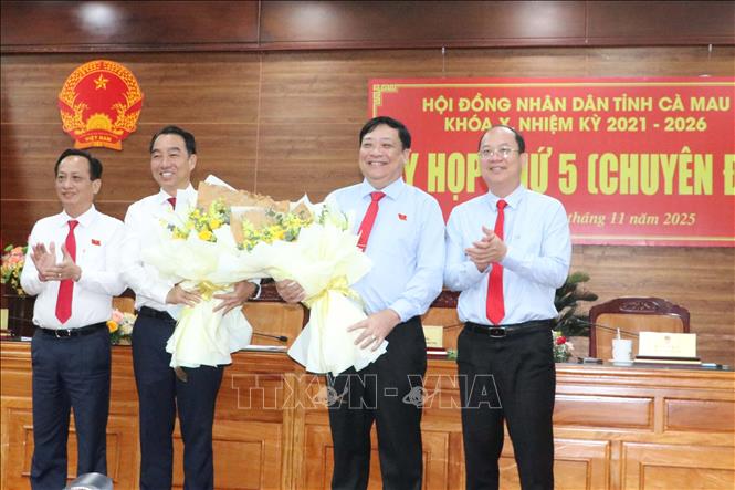 Lãnh đạo Tỉnh ủy, HĐND tỉnh Cà Mau tặng hoa chúc mừng tân Chủ tịch UBND tỉnh Cà Mau Lữ Quang Ngời (thứ 2, từ trái qua) và ông Phạm Thành Ngại, nguyên Phó Bí thư Tỉnh ủy, Chủ tịch UBND tỉnh Cà Mau được điều động nhận nhiệm vụ mới.