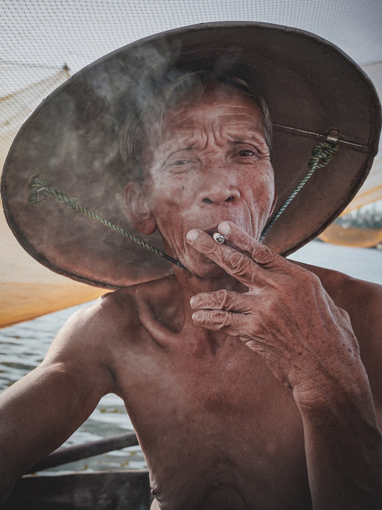 Với Khánh Phan, bức ảnh chụp cùng nhân vật này được chị cho biết thực hiện vào khoảng tháng 6.2024 tại Hội An. Tác phẩm cũng đi theo mô típ dùng cá che trước gương mặt, nhưng không đặt thành hai mắt đối xứng như “Fish Eyes”. Ở đây, bức ảnh thiên về chân dung cận, nhấn vào một bên gương mặt, chất da, nếp nhăn và thần thái của nhân vật. Theo chia sẻ của nữ nhiếp ảnh gia, tấm ảnh từng được đăng trên Instagram, đạt lượng tương tác lớn và sau đó được mua độc quyền trong hai năm.