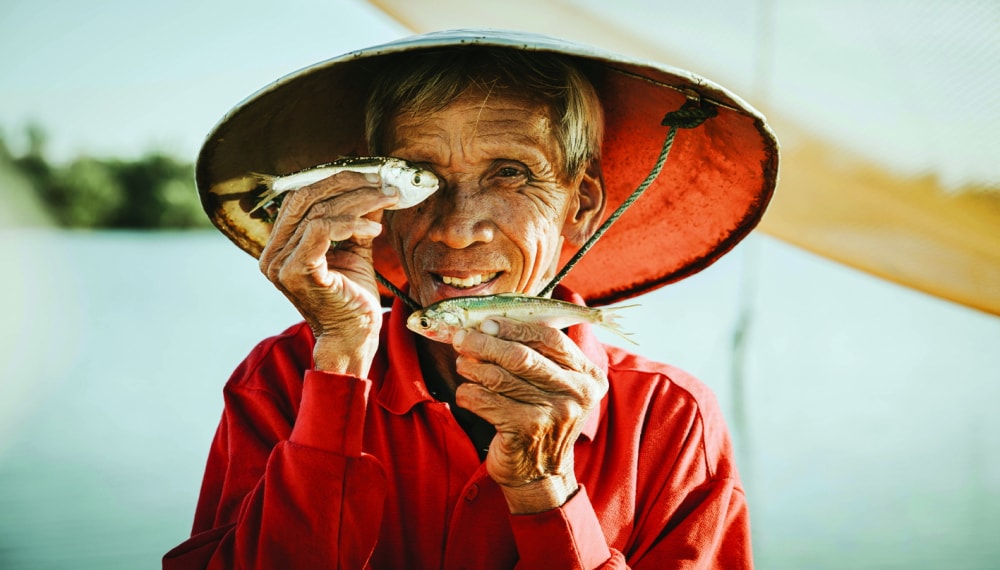 Tác phẩm chụp ngư dân ở Hội An của nhiếp ảnh gia Khánh Phan, với mô típ dùng cá che trước gương mặt nhân vật - Ảnh: Khánh Phan