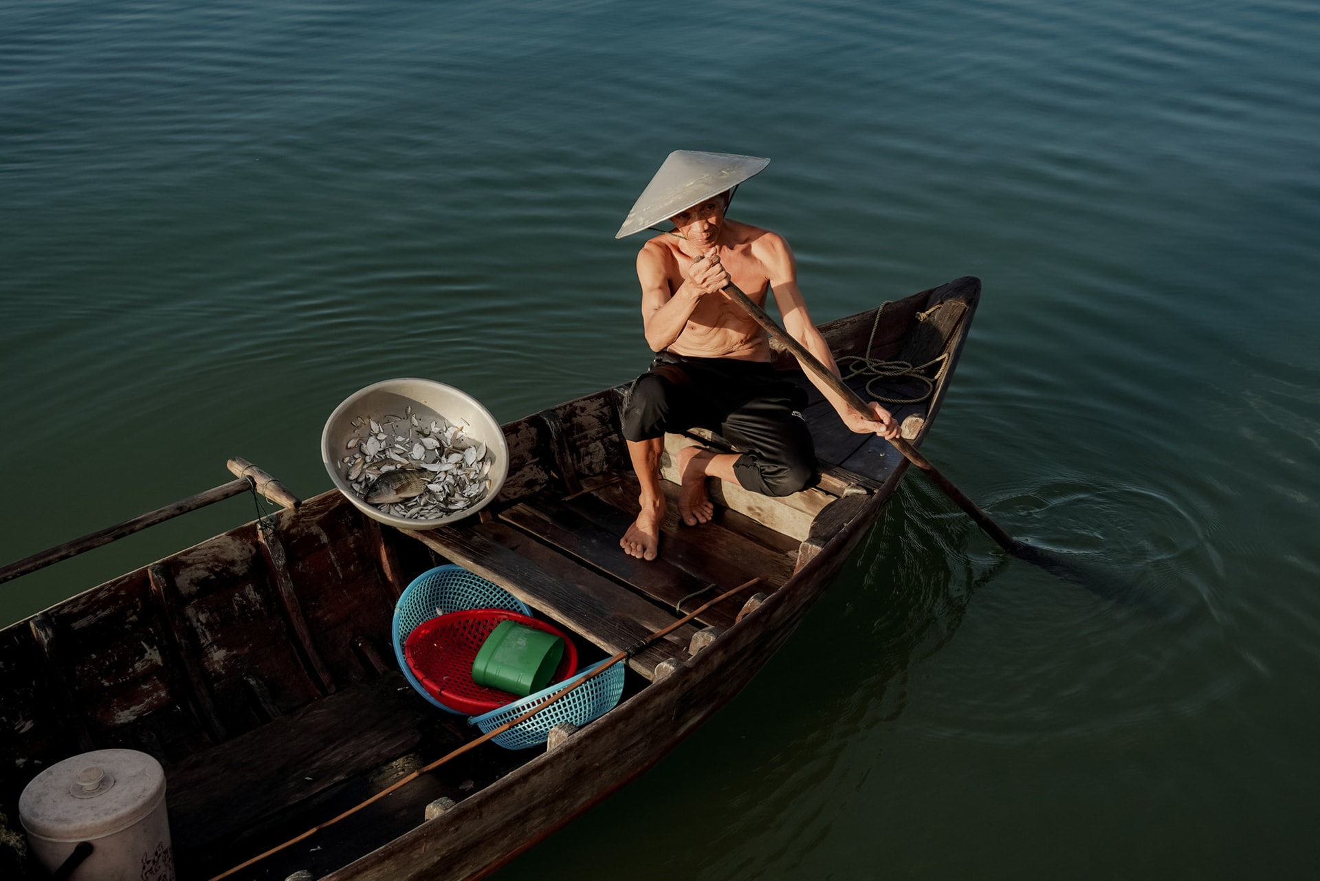 Kết thúc một buổi kéo rớ của ông Mười trên sông Thu Bồn - Ảnh: Đỗ Vũ