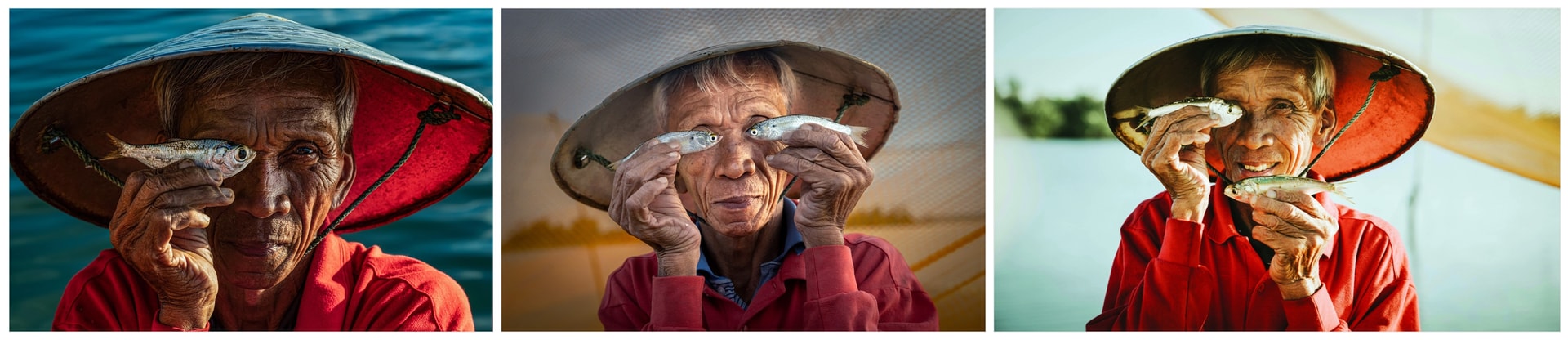 Ba tác phẩm cùng chụp ông Mười với mô típ dùng cá che trước mắt hoặc trước mặt, từ trái sang phải lần lượt là ảnh của Khánh Phan, Sophia Spurgin và Phạm Văn Vũ