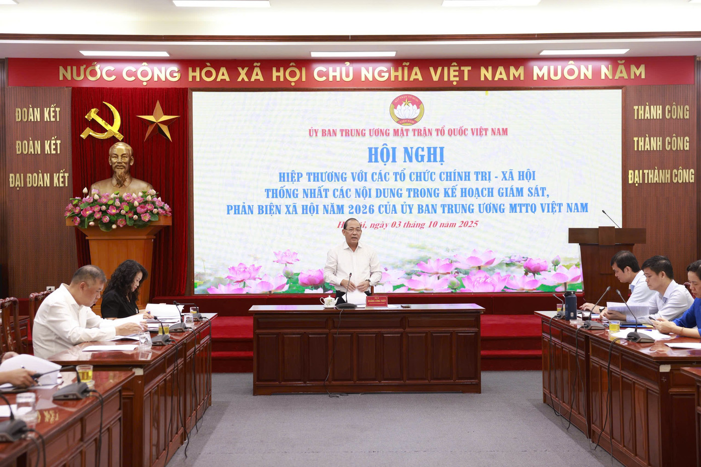 Sáng 3/10, Ban Thường trực Ủy ban Trung ương Mặt trận Tổ quốc (MTTQ) Việt Nam tổ chức hội nghị hiệp thương với các tổ chức chính trị - xã hội thống nhất kế hoạch giám sát, phản biện xã hội năm 2026 của Ủy ban Trung ương MTTQ Việt Nam.