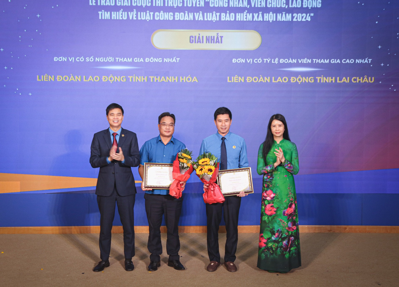 Phó Chủ tịch Tổng LĐLĐVN Ngọ Duy Hiểu (ngoài cùng bên trái) và bà Trần Lan Phương, Phó Chủ tịch Thường trực Hội Liên hiệp phụ nữ Việt Nam (ngoài cùng bên phải) trao giải Nhất tập thể Cuộc thi trực tuyến CNVCLĐ tìm hiểu về Luật Công đoàn và Luật Bảo hiểm xã hội năm 2024 cho 2 đơn vị.