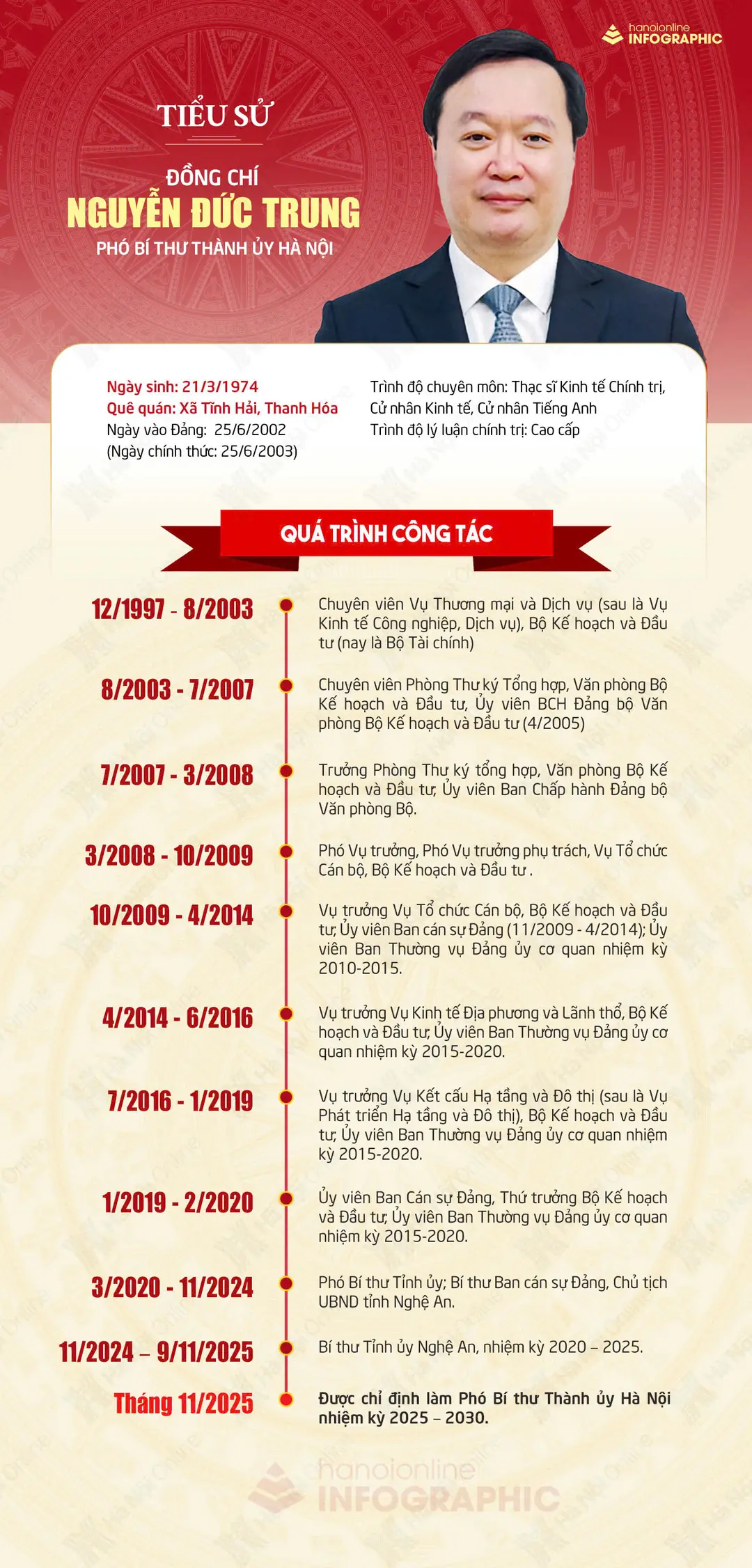 Tại Hội nghị công bố quyết định của Bộ Chính trị về công tác cán bộ, đồng chí Nguyễn Đức Trung bày tỏ niềm vinh dự và xúc động khi được Bộ Chính trị tin tưởng, điều động, chỉ định tham gia Ban Chấp hành, Ban Thường vụ và giữ chức Phó Bí thư Thành ủy Hà Nội nhiệm kỳ 2025–2030.