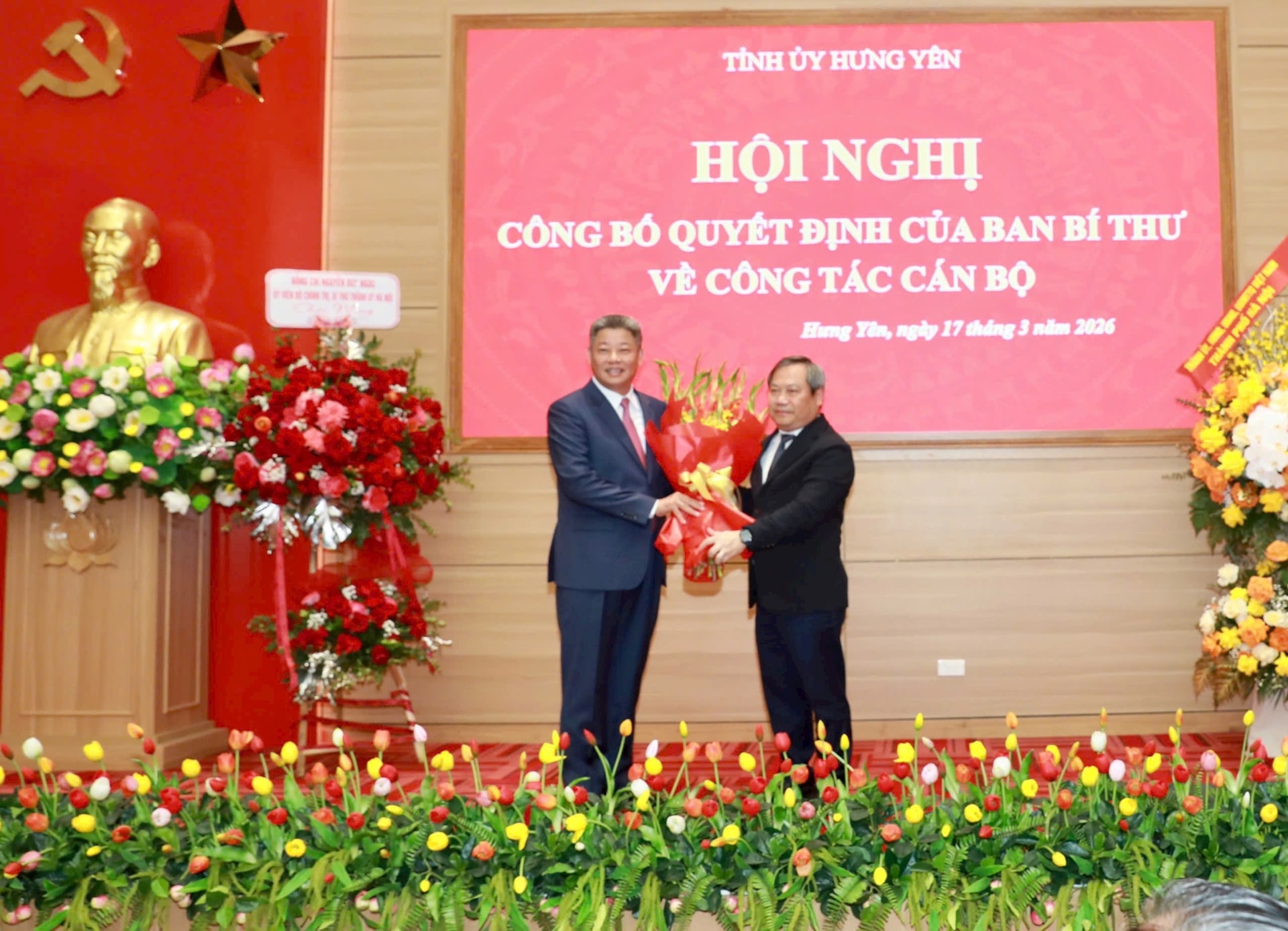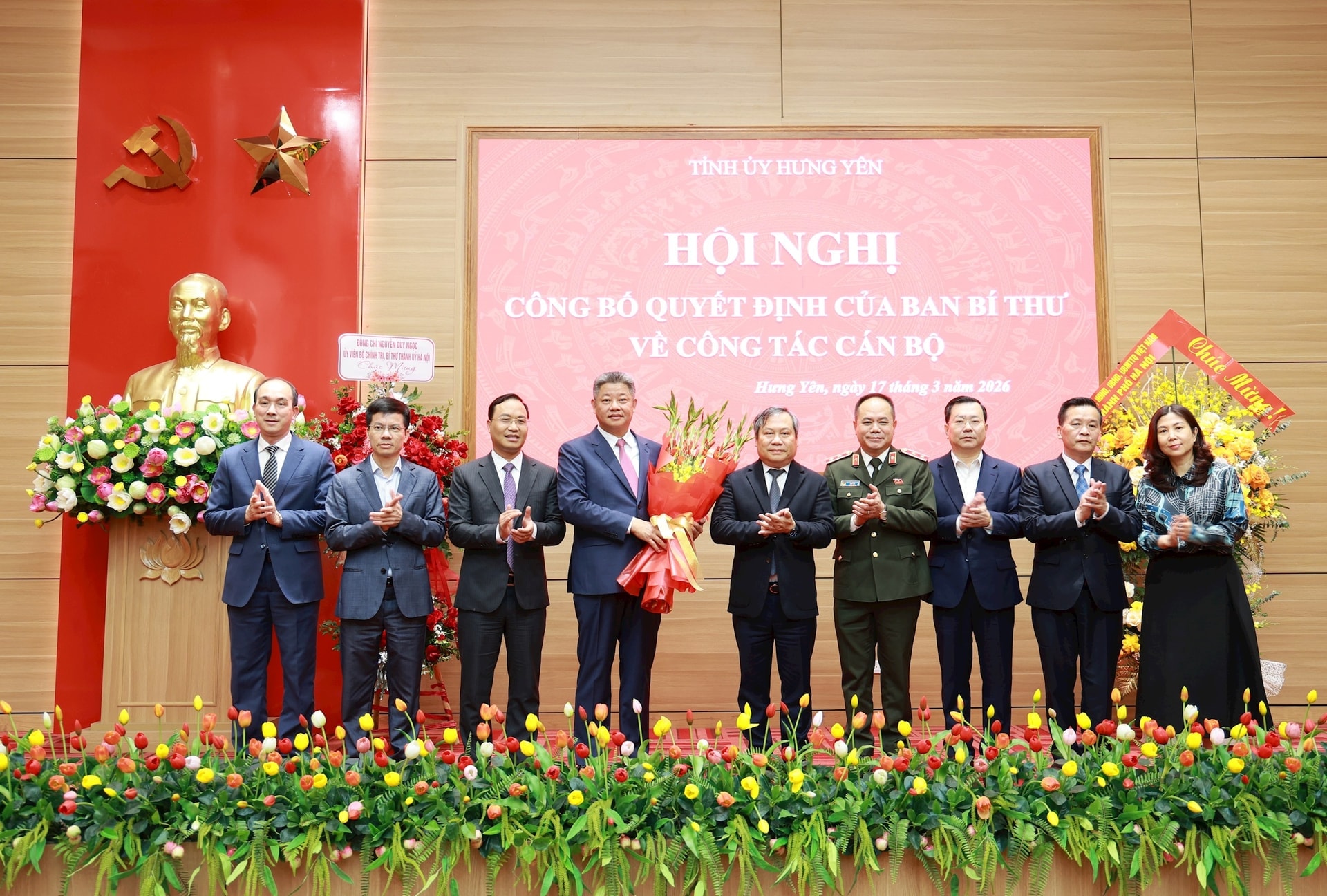Thường trực Tỉnh ủy Hưng Yên tặng hoa chúc mừng tân Phó Bí thư Tỉnh ủy Hưng Yên Nguyễn Mạnh Quyền. Ảnh: Đình Hiệp