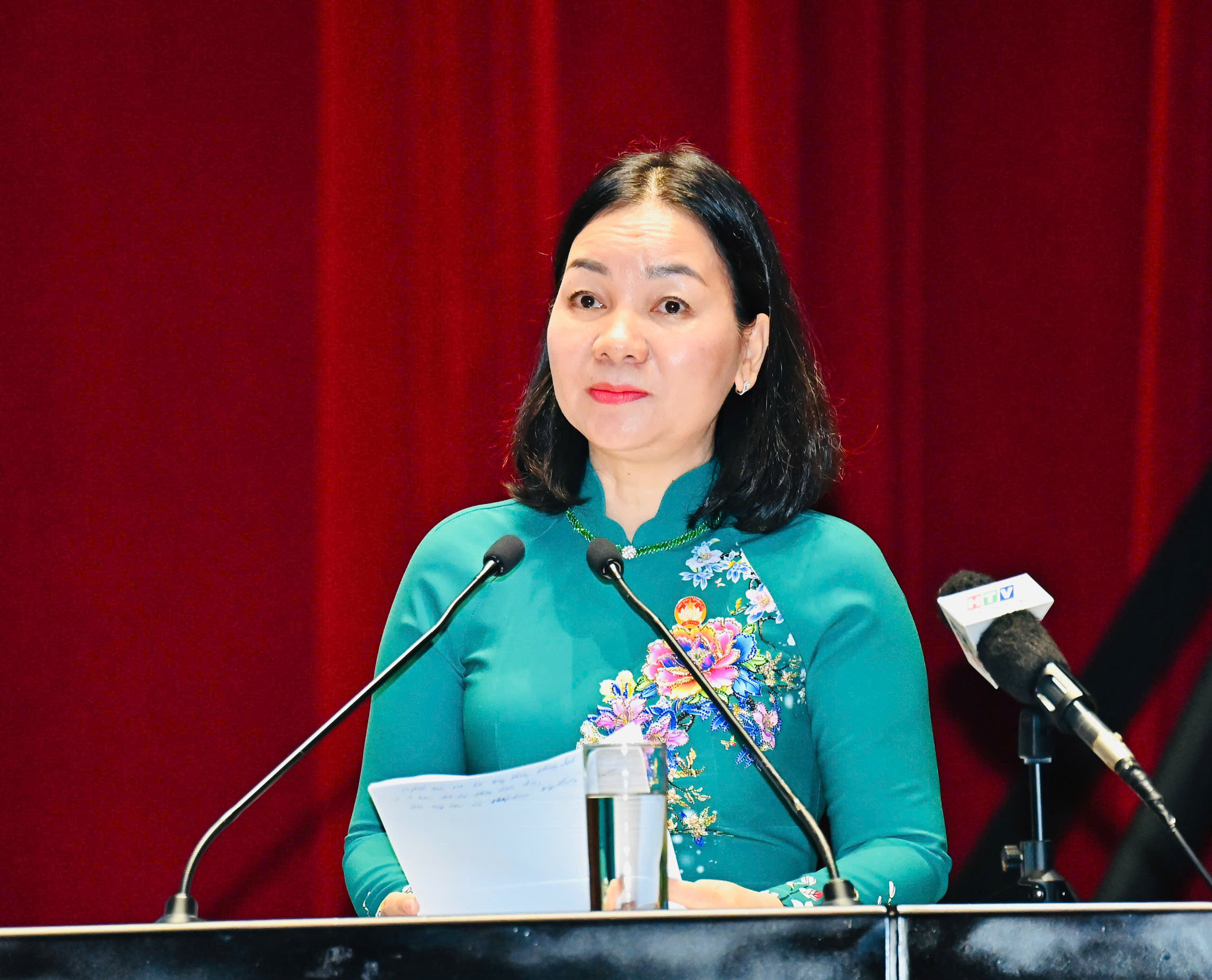 Bà Trương Thị Bích Hạnh, Ủy viên Ban Thường vụ Thành ủy, Phó Chủ tịch Thường trực Ủy ban MTTQ Việt Nam TP.HCM báo cáo tại đại hội. (Ảnh: Việt Dũng)