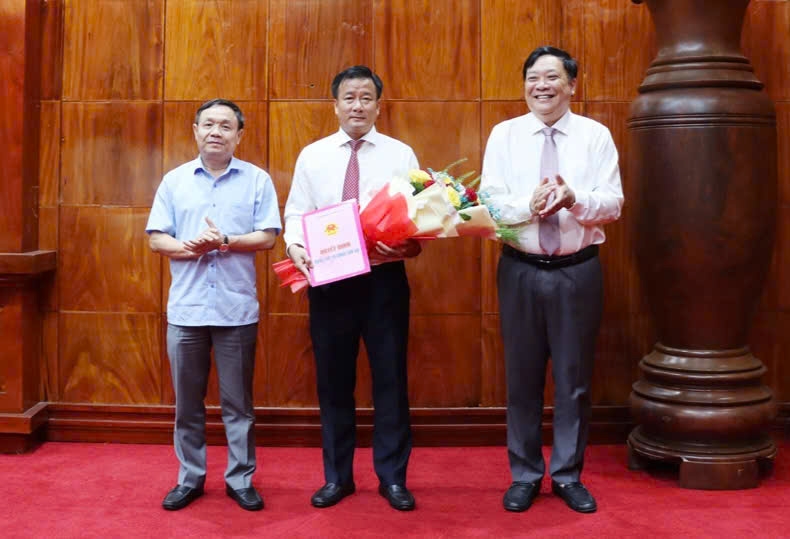 Ông Phan Văn Thắng - Phó Bí thư thường trực Tỉnh ủy và ông Phạm Thành Ngại - Chủ tịch UBND tỉnh Đồng Tháp trao quyết định và tặng hoa chúc mừng ông Nguyễn Phước Thiện.