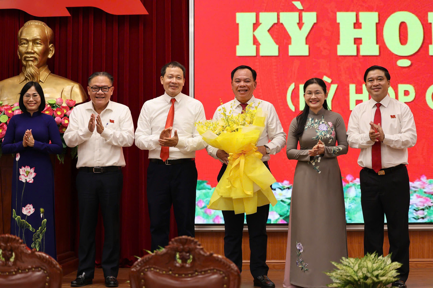 Ông Võ Tấn Đức (nhận hoa) sau khi được miễn nhiệm chức danh Chủ tịch UBND tỉnh