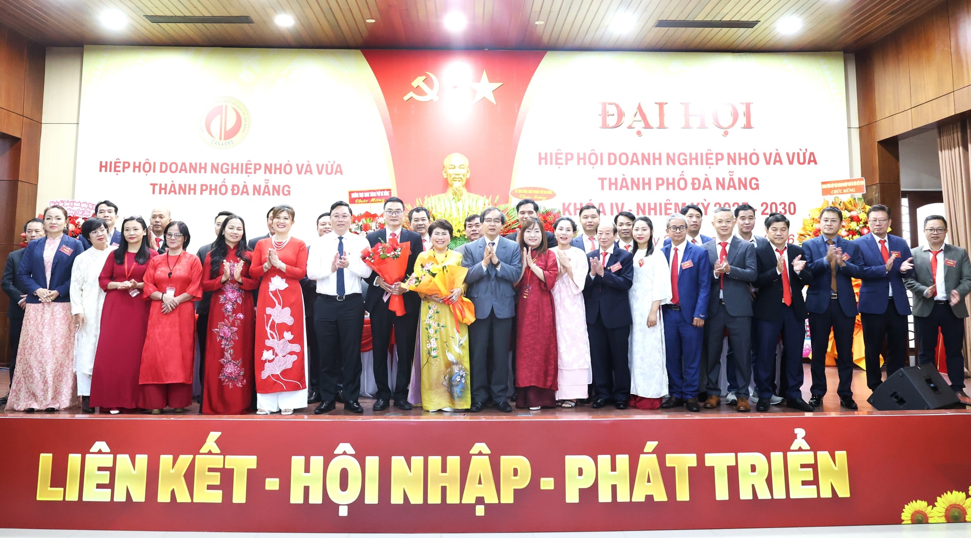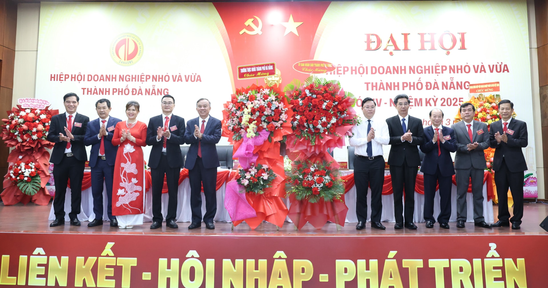 Lãnh đạo thành phố Đà Nẵng tặng hoa chúc mừng đại hội Hiệp hội doanh nghiệp nhỏ và vừa thành phố Đà Nẵng. Ảnh: NGỌC HÀ