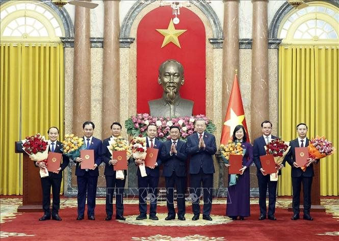 Tổng Bí thư, Chủ tịch nước Tô Lâm trao Quyết định bổ nhiệm Thống đốc Ngân hàng Nhà nước cho ông Phạm Đức Ấn (thứ nhất từ phải sang) và các Bộ trưởng. Đồng chí Trần Cẩm Tú - Ủy viên Bộ Chính trị, Thường trực Ban Bí thư - tặng hoa chúc mừng các đồng chí mới được bổ nhiệm - Ảnh: TTXVN