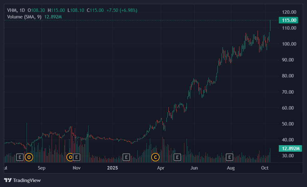 Sau phiên tăng trần hôm nay, thị giá VHM chính thức chạm mốc 115.000 đồng/cổ phiếu, mức cao nhất kể từ khi niêm yết. Tính từ đầu năm 2025 đến nay, cổ phiếu VHM đã tăng gần 3 lần, dù vậy, hiệu suất vẫn thấp hơn so với mã VIC của Tập đoàn Vingroup.