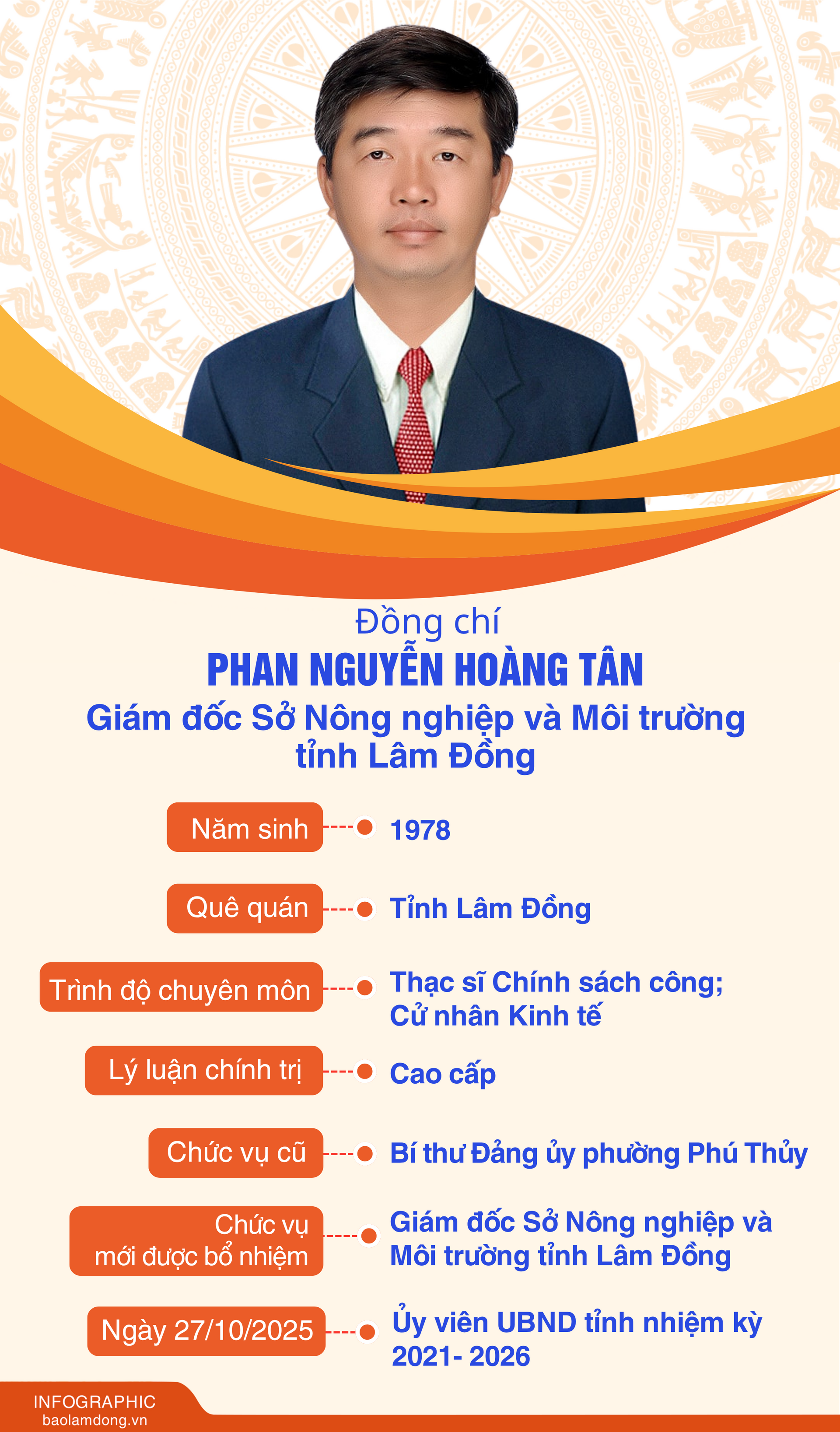Theo Quyết định số 120 ngày 24/10/2025 của Ban Thường vụ Tỉnh ủy về việc điều động cán bộ lãnh đạo, quản lý, ông Phan Nguyễn Hoàng Tân được điều động đến nhận công tác tại UBND tỉnh và được Chủ tịch UBND tỉnh bổ nhiệm giữ chức vụ Giám đốc Sở Nông nghiệp và Môi trường Lâm Đồng.
