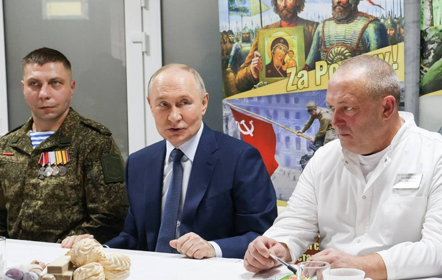 Tổng thống Nga Vladimir Putin thăm bệnh viện quân y ở Moscow, nơi ông công bố cuộc thử nghiệm ngư lôi Poseidon. Ảnh: TASS