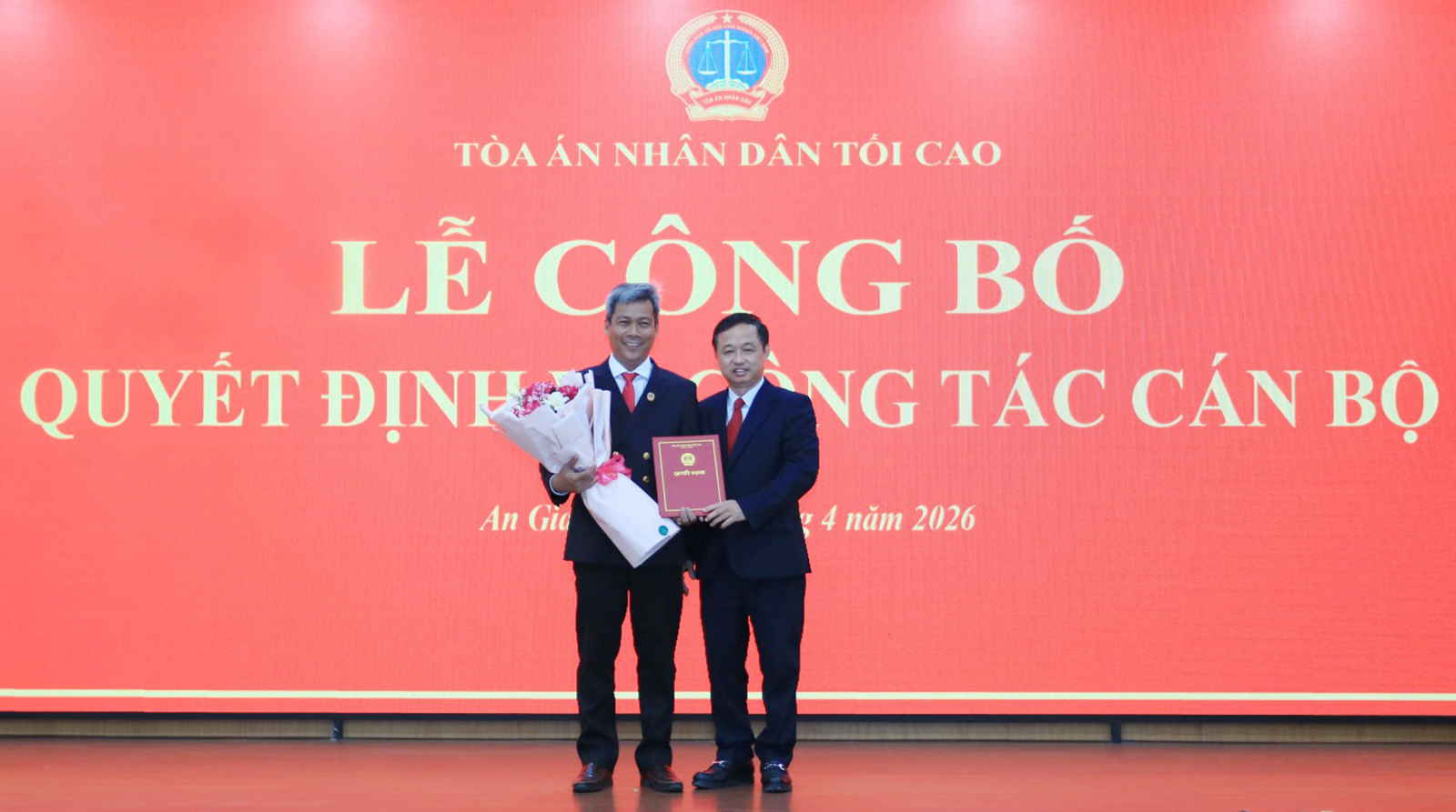 Phó Chánh án Tòa án nhân dân tối cao Nguyễn Biên Thùy trao quyết định và tặng hoa chúc mừng Chánh án Tòa án nhân dân tỉnh An Giang Thái Rết.