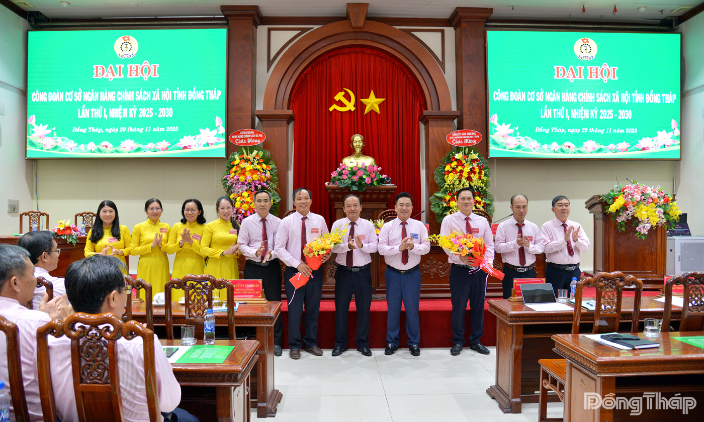 Phó Tổng Giám đốc Ngân hàng Chính sách xã hội Huỳnh Văn Thuận và Giám đốc Chi nhánh Ngân hàng Chính sách xã hội tỉnh Đồng Tháp Dương Văn Hoàng tặng hoa chúc mừng Ban Chấp hành Công đoàn cơ sở Ngân hàng Chính sách xã hội tỉnh Đồng Tháp khóa I, nhiệm kỳ 2025 - 2030.