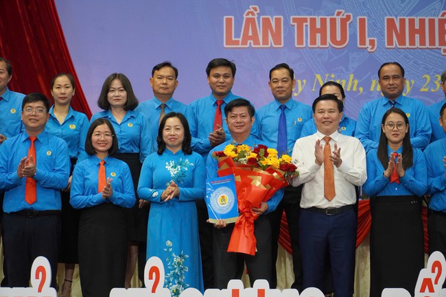 Bà Thái Thu Xương, Phó Chủ tịch Thường trực Tổng Liên đoàn Lao động Việt Nam, và ông Nguyễn Thanh Hải, Phó Bí thư Tỉnh ủy, Chủ tịch Ủy ban MTTQ Việt Nam tỉnh Tây Ninh, chúc mừng Ban chấp hành