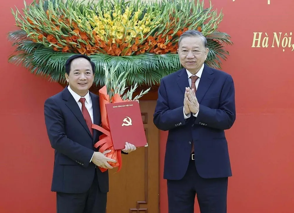 Tổng Bí thư Tô Lâm trao Quyết định, tặng hoa chúc mừng cho tân Trưởng Ban Tuyên giáo và Dân vận Trung ương Trịnh Văn Quyết. Ảnh: TTXVN