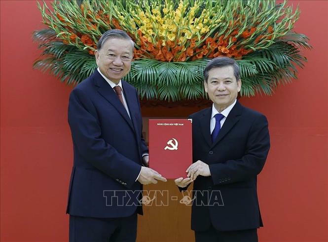 Tổng Bí thư Tô Lâm trao Quyết định của Bộ Chính trị điều động, phân công, bổ nhiệm đồng chí Lê Minh Trí giữ chức Phó Trưởng Ban Thường trực Ban Nội chính Trung ương. Ảnh: Thống Nhất/TTXVN.