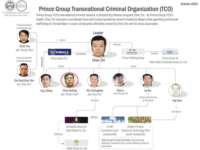 Mỹ tuyên bố trừng phạt 146 thực thể và cá nhân thuộc Prince Group, nhiều công ty được đăng ký với tên giống nhau tại các quốc gia. Ví dụ, “Skyline Investment” có công ty cùng tên tại Singapore và Campuchia, là công ty đầu tư cá nhân của Chen Zhi; còn “Warp Data” tại Lào phụ trách đào Bitcoin và rửa tiền bằng tiền mã hóa.