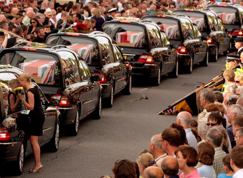 Người dân bày tỏ sự thương tiếc khi thi thể của 7 binh sĩ Anh thiệt mạng ở Afghanistan được đưa qua đường ở Wootton Bassett, Anh vào ngày 29/6/2010. Ảnh: Getty.