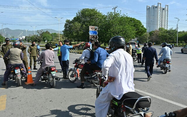 Lực lượng an ninh hướng dẫn người dân đi theo các tuyến đường thay thế tại một chốt kiểm soát gần khách sạn Serena thủ đô Islamabad (Pakistan) ngày 21-4 trước thềm các cuộc đàm phán tiềm năng giữa Mỹ-Iran. Ảnh: AFP