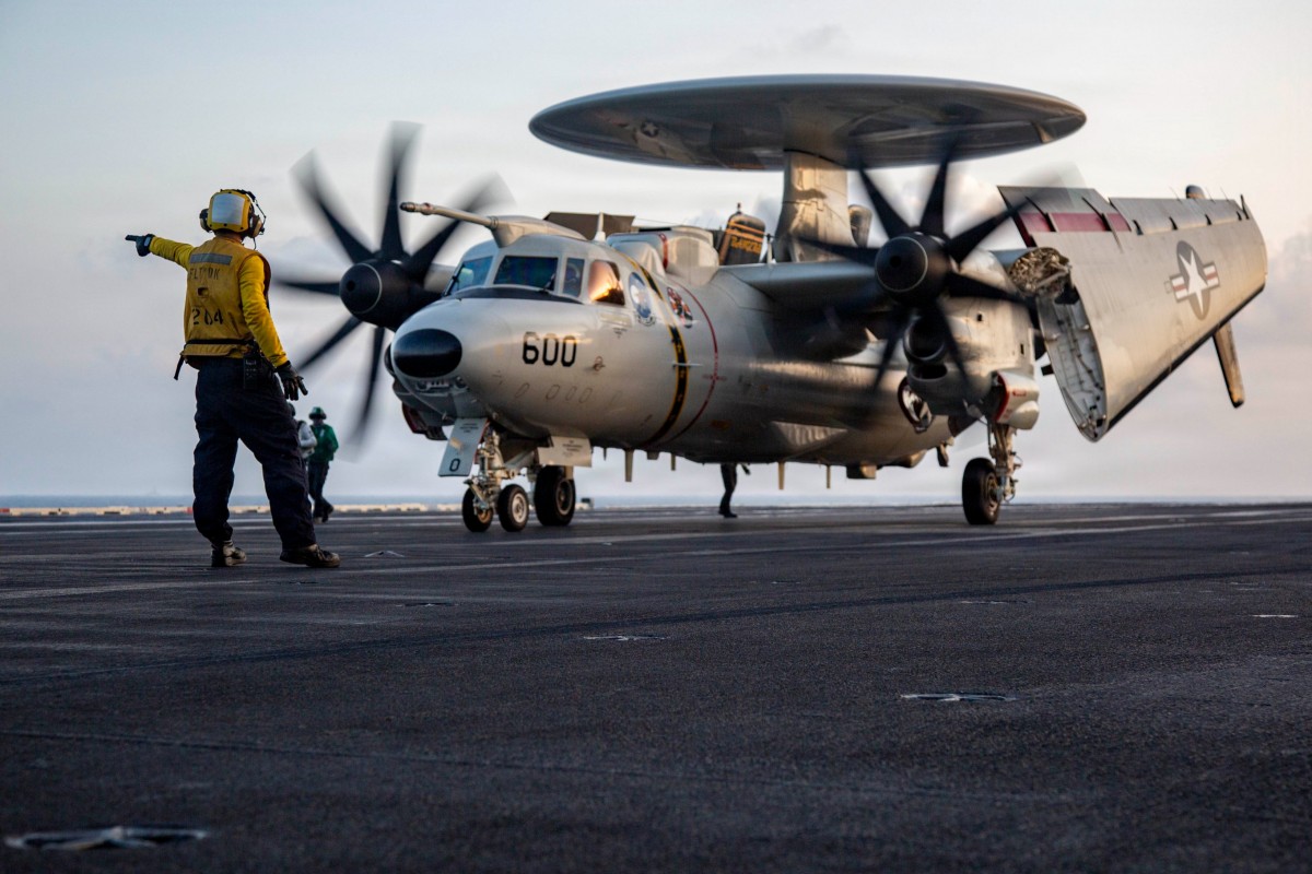 Một chiếc E-2D Advanced Hawkeye chuẩn bị cất cánh từ tàu sân bay USS Abraham Lincoln trong chiến dịch quân sự nhằm vào Iran. Ảnh: X/@CENTCOM