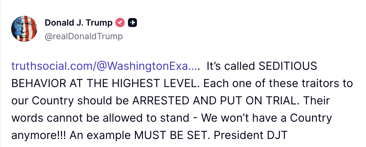 Sáng 20/11 (giờ địa phương), ông viết trên Truth Social: “Đây là hành vi phản loạn ở mức độ cao nhất. Từng kẻ phản bội đất nước này phải bị bắt và đưa ra xét xử”.