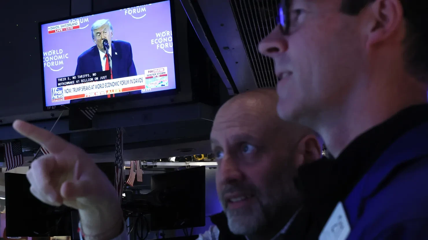 Các nhà giao dịch làm việc trên sàn giao dịch chứng khoán New York (Mỹ) sáng ngày 21.1, khi ông Trump phát biểu tại Diễn đàn Kinh tế Thế giới 2026 - Ảnh: Getty Images