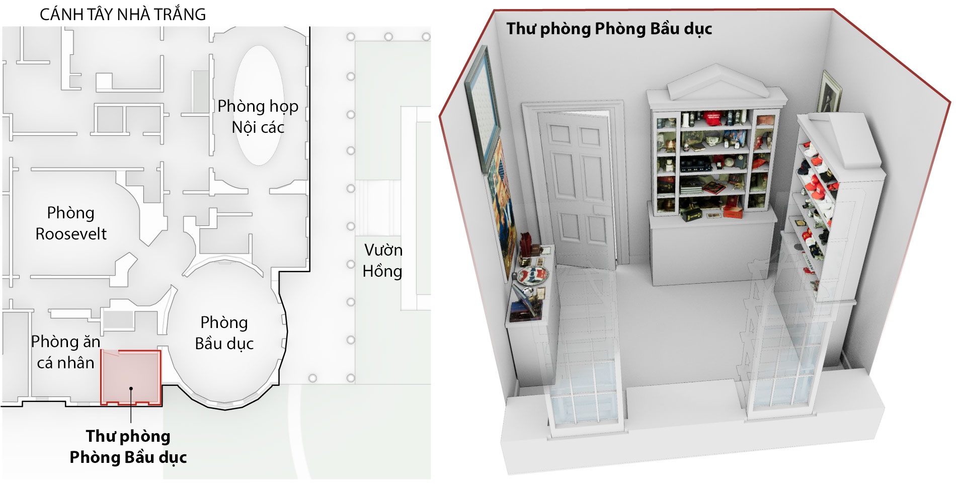 Thư phòng là một phần của cụm phòng riêng gồm phòng vệ sinh và phòng ăn, nằm ngay cạnh Phòng Bầu dục để tổng thống sử dụng. Ông Trump hầu như không làm việc tại đây chỉ để khoe vật phẩm trưng bày với các lãnh đạo. Trong cuộc gặp tháng 8, ông từng giới thiệu chúng với Tổng thống Pháp Emmanuel Macron và Tổng thống Ukraine Volodymyr Zelensky. Trước đó, một video trên mạng xã hội cho thấy ông đưa Tổng thống Azerbaijan Ilham Aliyev tham quan phòng. Đồ họa: New York Times.