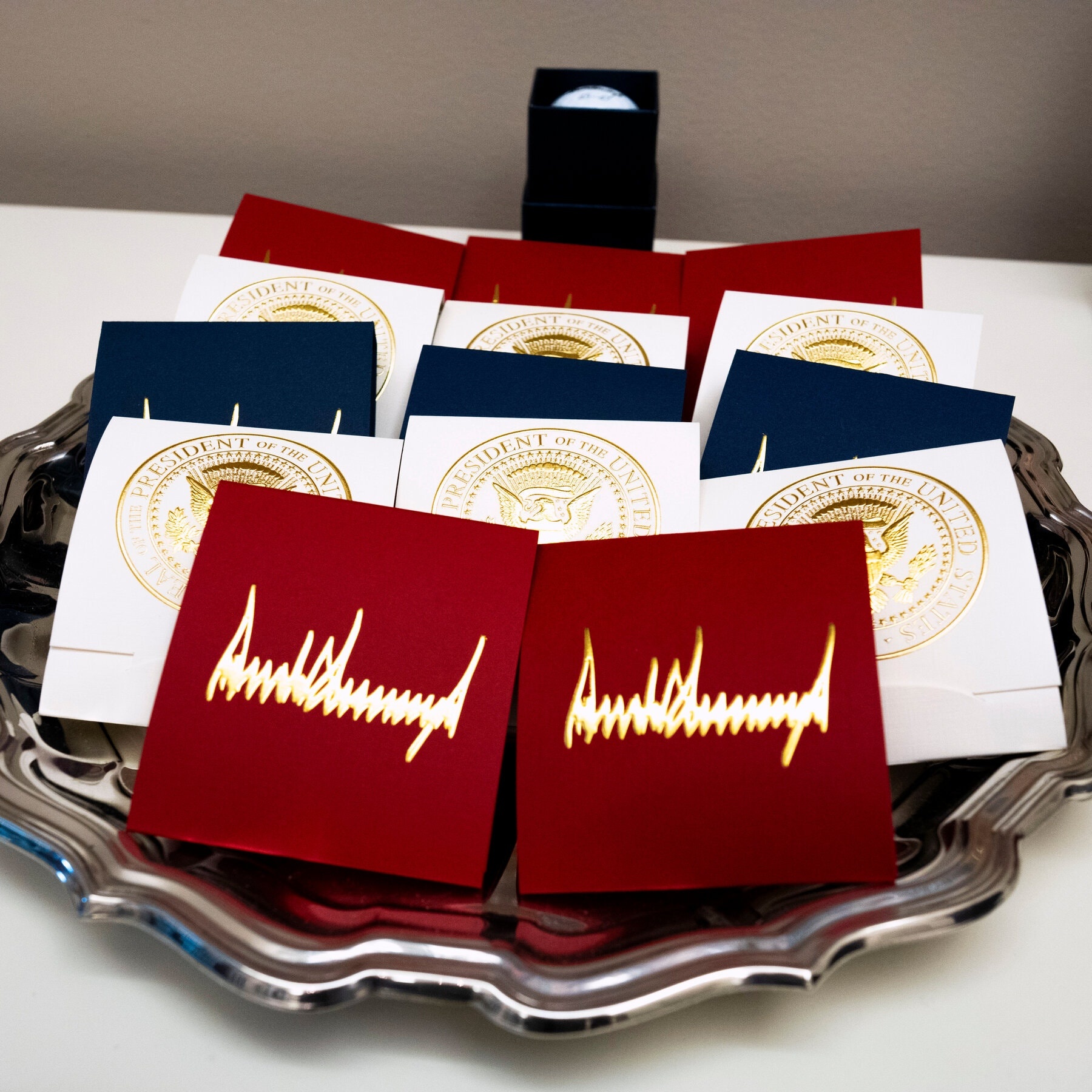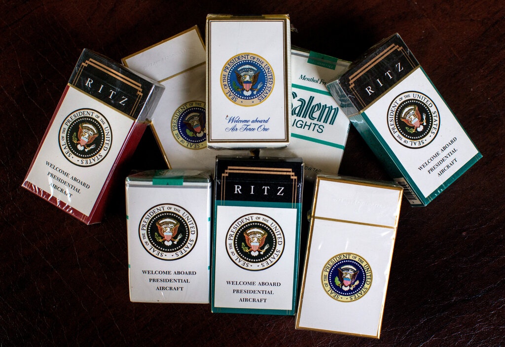 Việc khách mời của tổng thống được nhận quà hay đồ lưu niệm không phải điều lạ thường. Chẳng hạn, khách mời đặt chân lên chuyên cơ Không lực Một trước đây có thể nhận được những bao thuốc lá in con dấu tổng thống (như trong ảnh) hoặc các gói kẹo sô cô la M&Ms có chữ ký tổng thống. Nhưng dành trọn thư phòng cho vật phẩm lưu niệm lại là dấu ấn đặc biệt của ông Trump. Ảnh: New York Times.