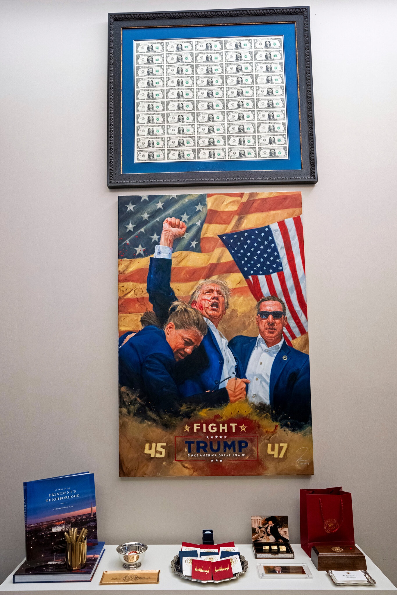 Hiện nay, thay thế cho chân dung ông Kennedy là tấm poster vẽ ông Trump giơ nắm tay sau vụ ám sát hụt ở Butler, Pennsylvania năm ngoái, cùng nhiều tờ tiền đôla Mỹ được đóng khung. Căn phòng không đặt chiếc bàn làm việc nào. Ảnh: New York Times.