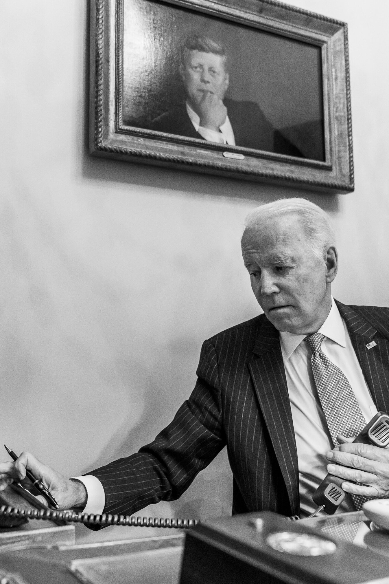 Tổng thống Joseph R. Biden Jr. từng nói với tạp chí kiến trúc Architectural Digest hồi tháng 12/2023 rằng ông thường sử dụng thư phòng làm nơi soạn bài phát biểu. Khi ấy, ông treo trên tường thư phòng bức chân dung Tổng thống John F. Kennedy, bức vẽ ngôi nhà thời thơ ấu của ông ở thành phố Scranton, Pennsylvania, cùng nhiều tranh và thư của trẻ em. Ảnh: Nhà Trắng.