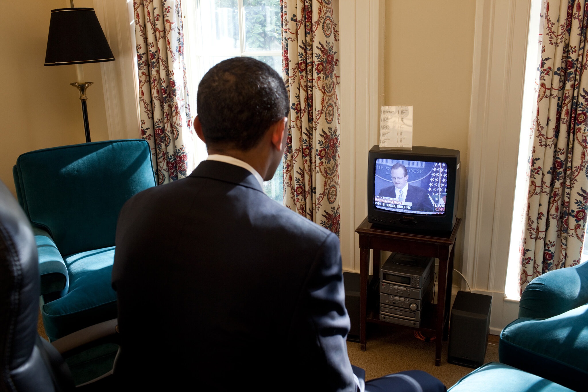 Những tổng thống khác dùng không gian này như văn phòng riêng để làm việc tập trung hoặc gọi điện mà không bị chú ý nhiều như tại Phòng Bầu dục.Trong ảnh, Tổng thống Barack Obama theo dõi một buổi họp báo vào tháng 1/2009. Ảnh: Kho lưu trữ Quốc gia Mỹ.