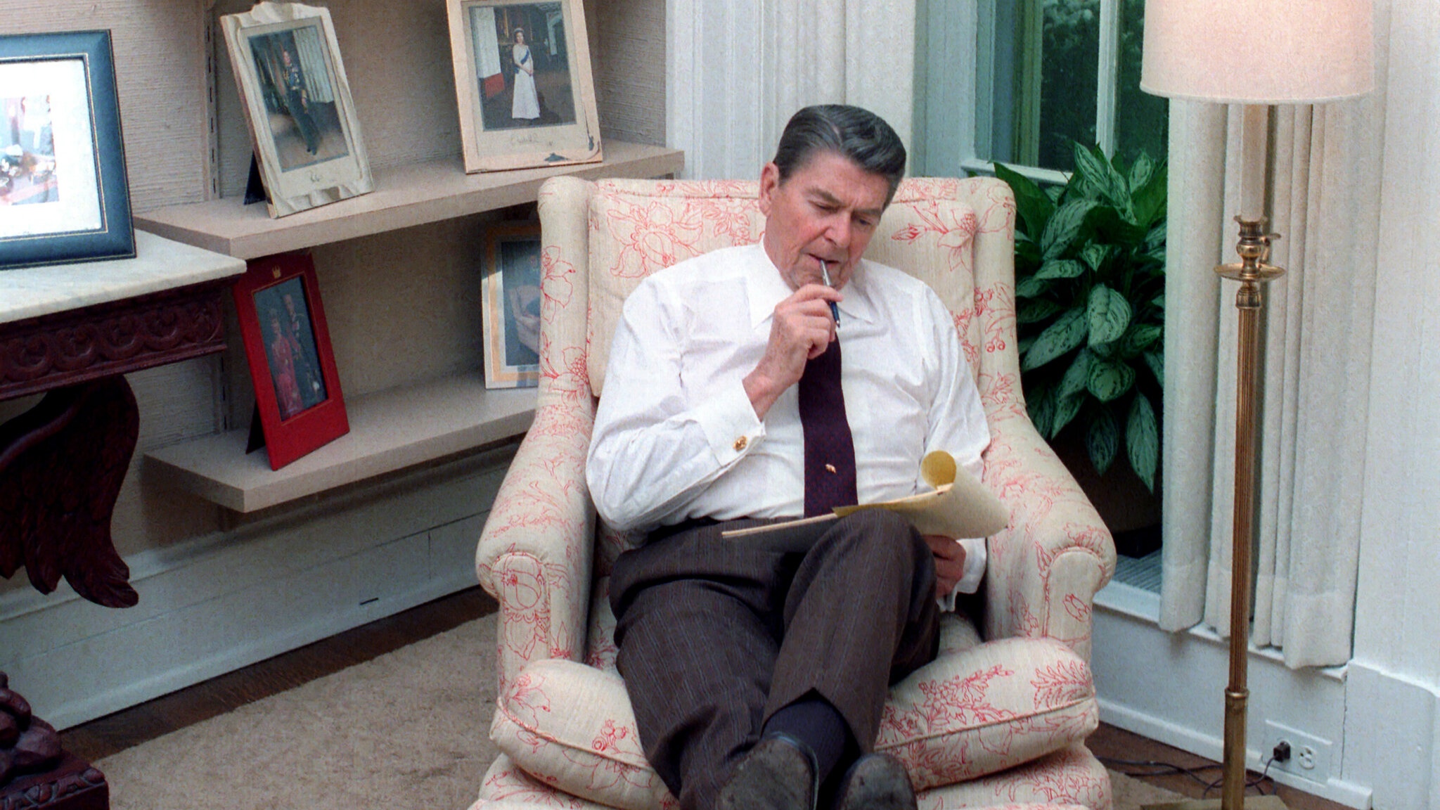 Ẩn sâu trong Nhà Trắng là một thư phòng nhỏ cạnh Phòng Bầu dục, được xem như chứng nhân của nhiều thập kỷ lịch sử. Nhưng nay thư phòng trông giống nơi bán đồ lưu niệm thương hiệu ông Trump. Ảnh lưu trữ cho thấy các tổng thống Mỹ từng làm việc hằng ngày tại đây, trong đó có Tổng thống Ronald Reagan đang soạn diễn văn nhậm chức năm 1985. Ảnh: Kho lưu trữ Quốc gia Mỹ. Ảnh: Kho lưu trữ Quốc gia Mỹ.
