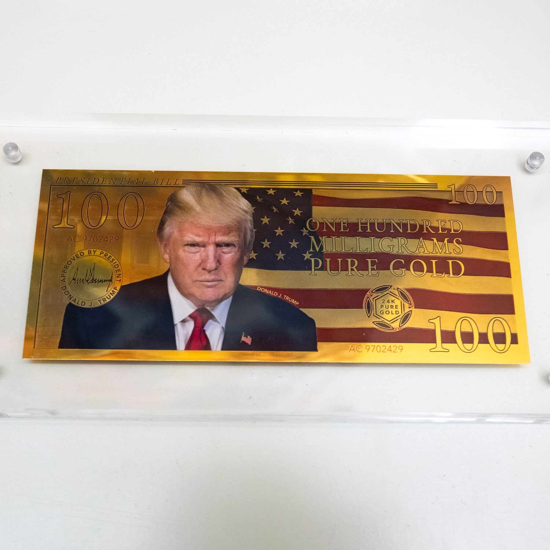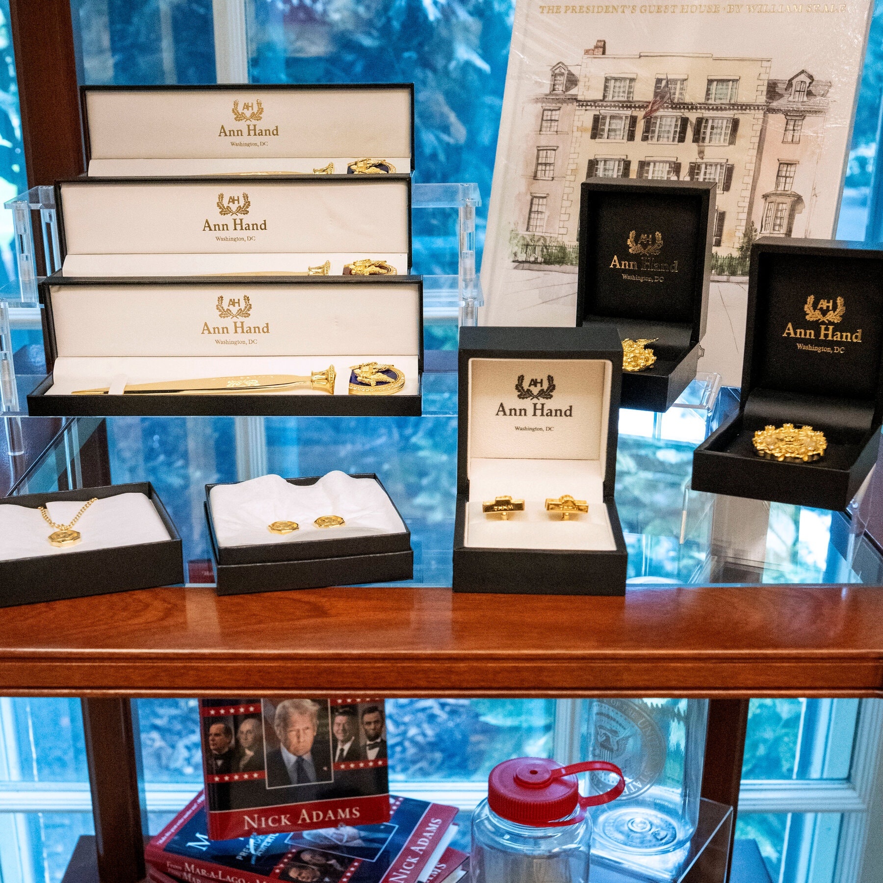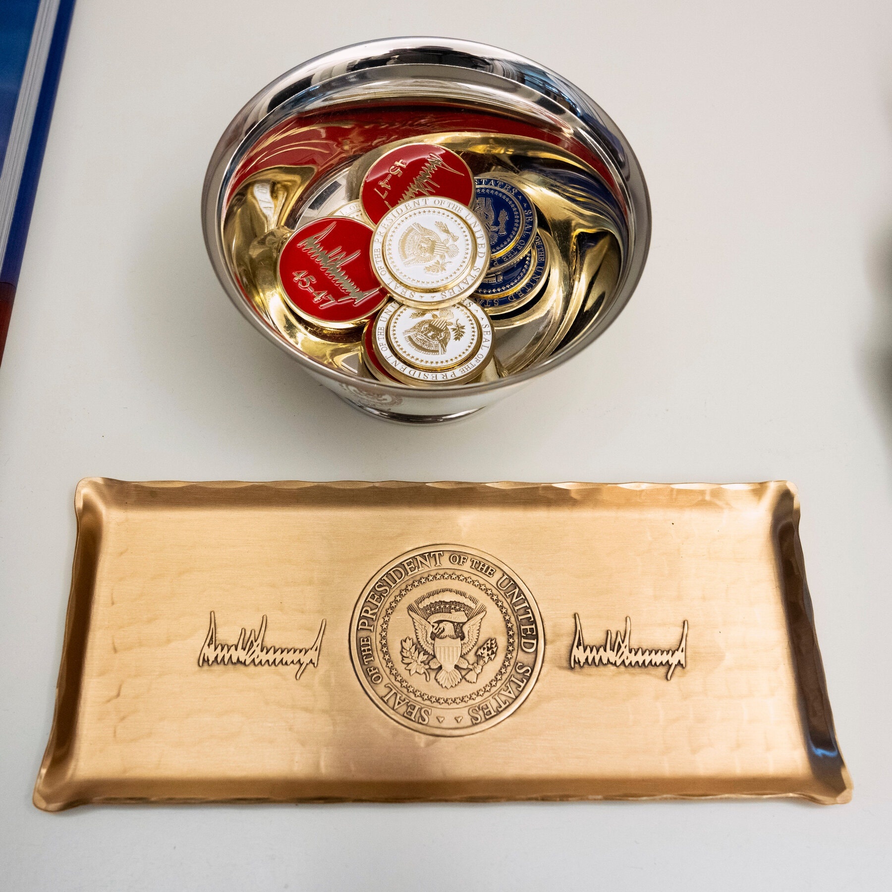 Các vật trưng bày trong thư phòng tháng 10 gồm “tờ tiền tổng thống” mạ vàng, trang sức của nhà thiết kế Ann Hand, đồng xu kỷ niệm và khay mạ vàng. Dù không bán trực tiếp cho khách, một số món vẫn xuất hiện trên Trump Store và cửa hàng của Hiệp hội Lịch sử Nhà Trắng. Một quan chức cho biết ông Trump đã biến thư phòng ít sử dụng thành phòng trưng bày quà tặng. Ảnh: New York Times.