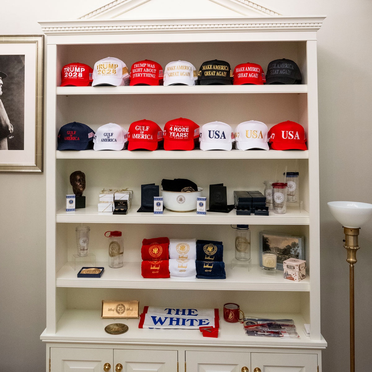 Dưới thời Tổng thống Donald Trump, căn phòng thay đổi đáng kể và chủ yếu được dùng để trưng bày các vật phẩm mang tên ông. Nhiều người ví nó như phiên bản thu nhỏ của cửa hàng lưu niệm thường thấy tại các bất động sản của ông Trump. Ảnh: New York Times.