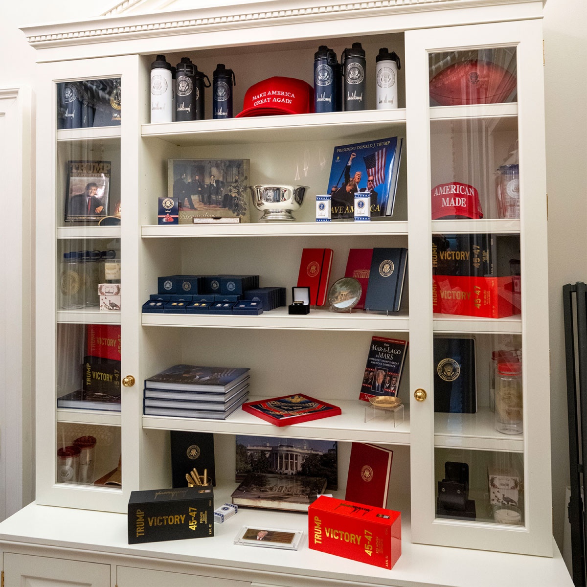 Giá sách trắng thứ hai trong thư phòng, chụp tháng 10, cũng trưng bày nhiều vật phẩm mang chủ đề Trump, từ mũ, nước hoa Victory 45-47 đến các món đồ in chữ ký ông dưới con dấu tổng thống. Nhiều cuốn sách do ông viết hoặc viết về ông, như “Nghệ thuật Đàm phán” hay “Cứu rỗi nước Mỹ”, cũng xuất hiện tại đây. Ảnh: New York Times.