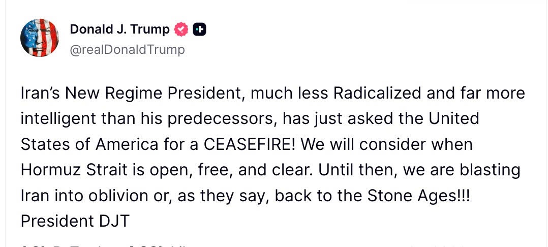 Theo Fox News, Tổng thống Donald Trump cho biết Tổng thống của “chính quyền mới” tại Iran đã đề nghị ngừng bắn.