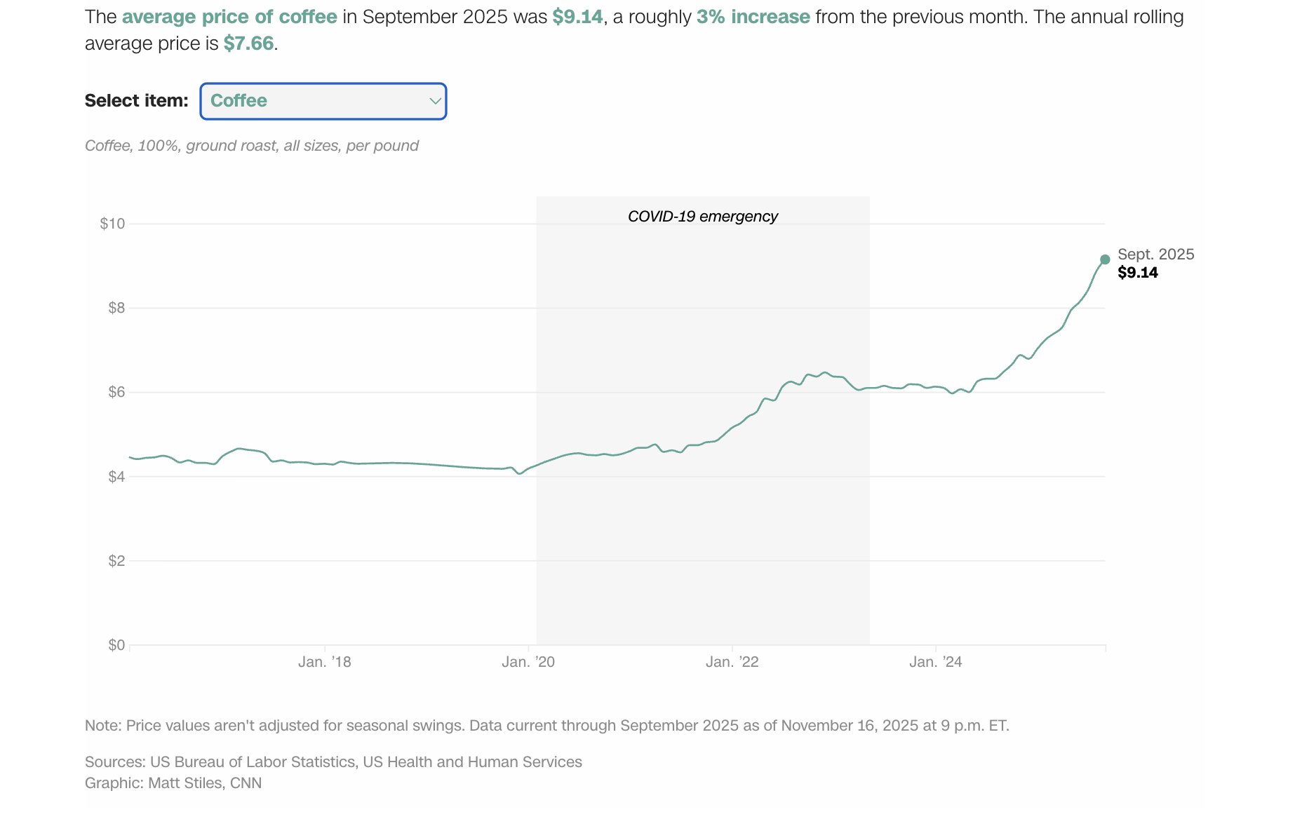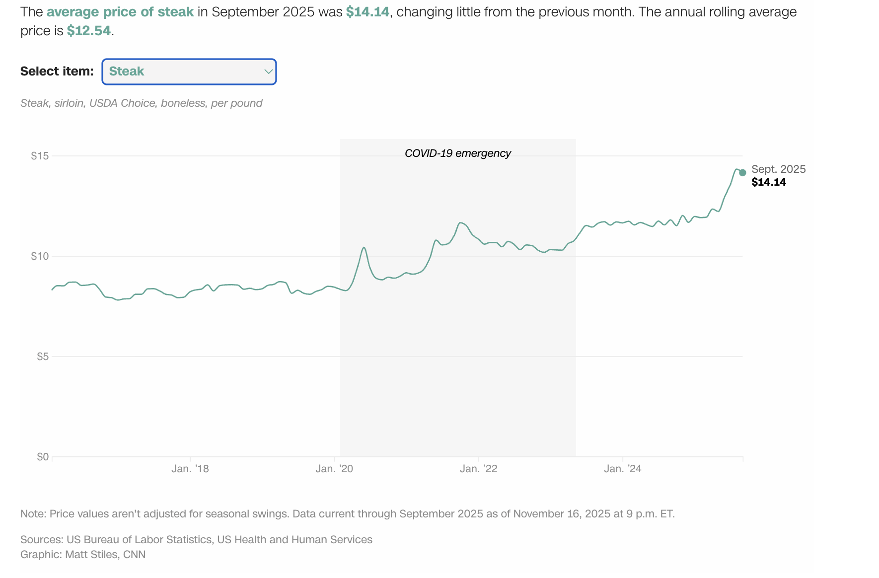 Giá thịt bò và cà phê tại Mỹ tăng phi mã sau lệnh áp thuế đối ứng của ông Trump. Biểu đồ: CNN.