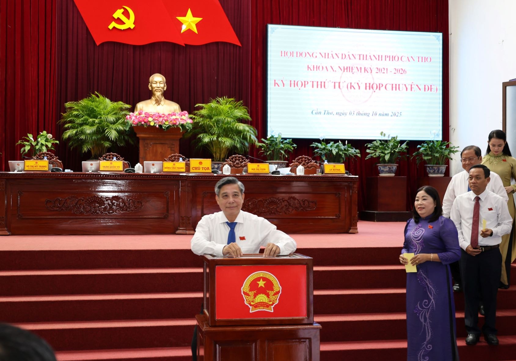 Các đại biểu bỏ phiếu bầu Chủ tịch UBND thành phố Cần Thơ nhiệm kỳ 2021 - 2026.