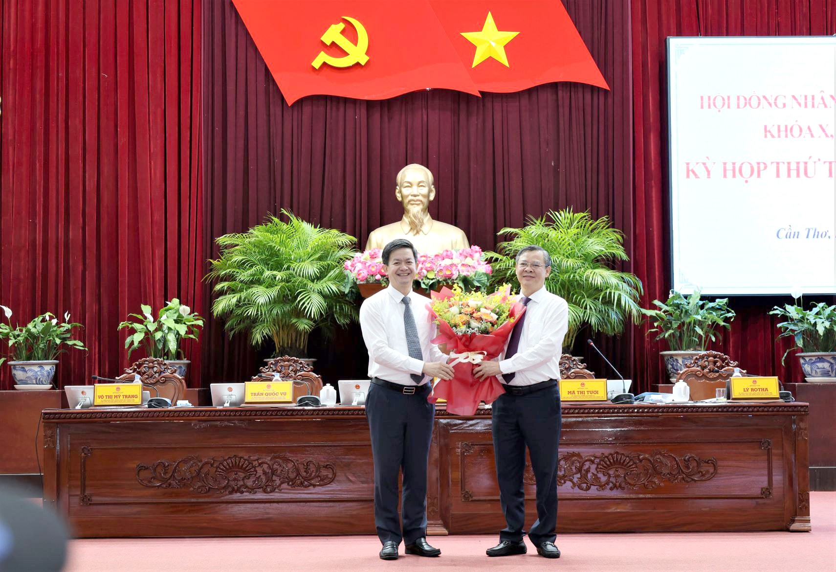 Bí thư Thành ủy Cần Thơ Lê Quang Tùng tặng hoa chúc mừng Chủ tịch UBND thành phố Trương Cảnh Tuyên.