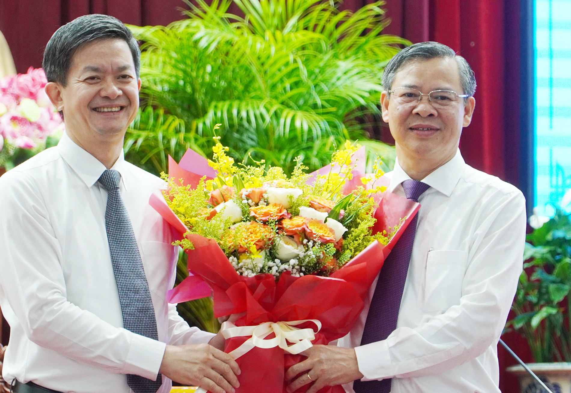 Bí thư Thành ủy Cần Thơ Lê Quang Tùng tặng hoa chúc mừng ông Trương Cảnh Tuyên. Ảnh: E.X