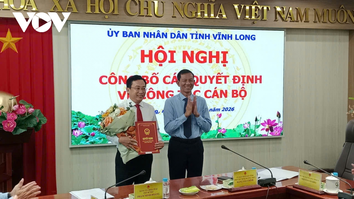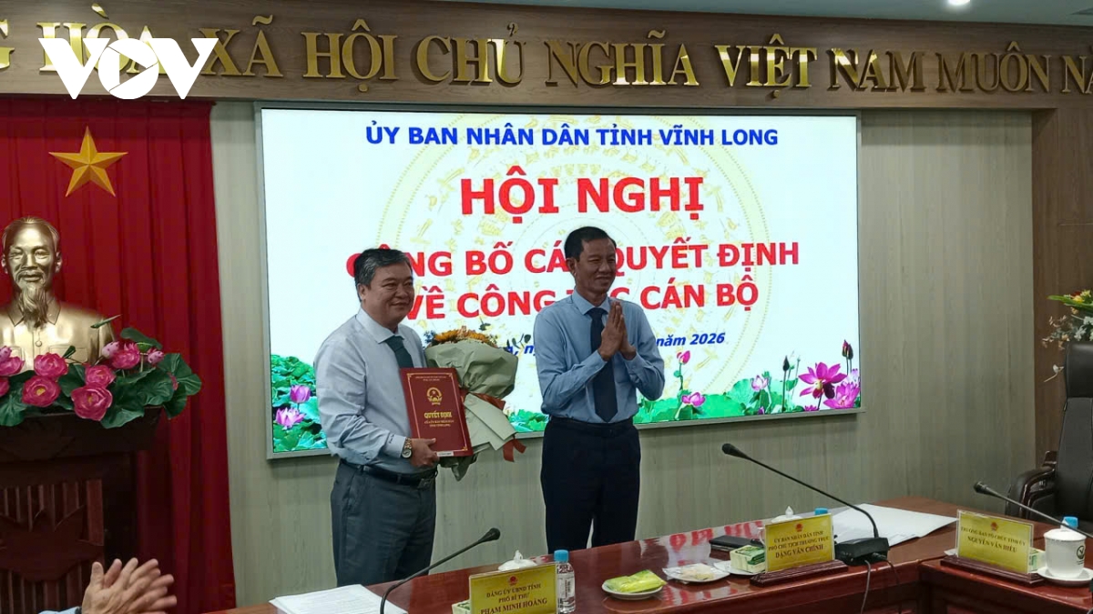 Ông Đặng Văn Chính, Ủy viên Ban Thường vụ Tỉnh ủy, Phó Chủ tịch Thường trực UBND tỉnh Vĩnh Long trao quyết định cho ông Võ Văn Phú
